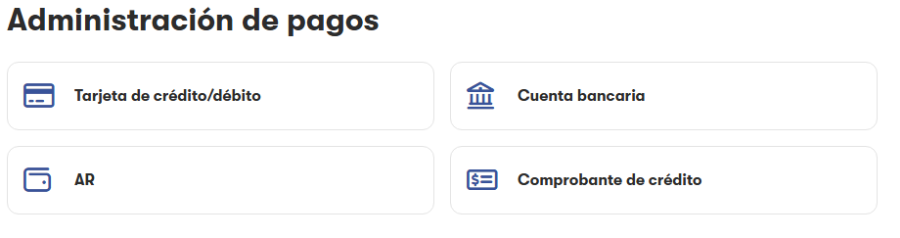 Así, podrás ver la sección de Administración de pagos, como AR, Cuanta bancaria, comprobante de crédito y Tarjeta de crédito o débito.